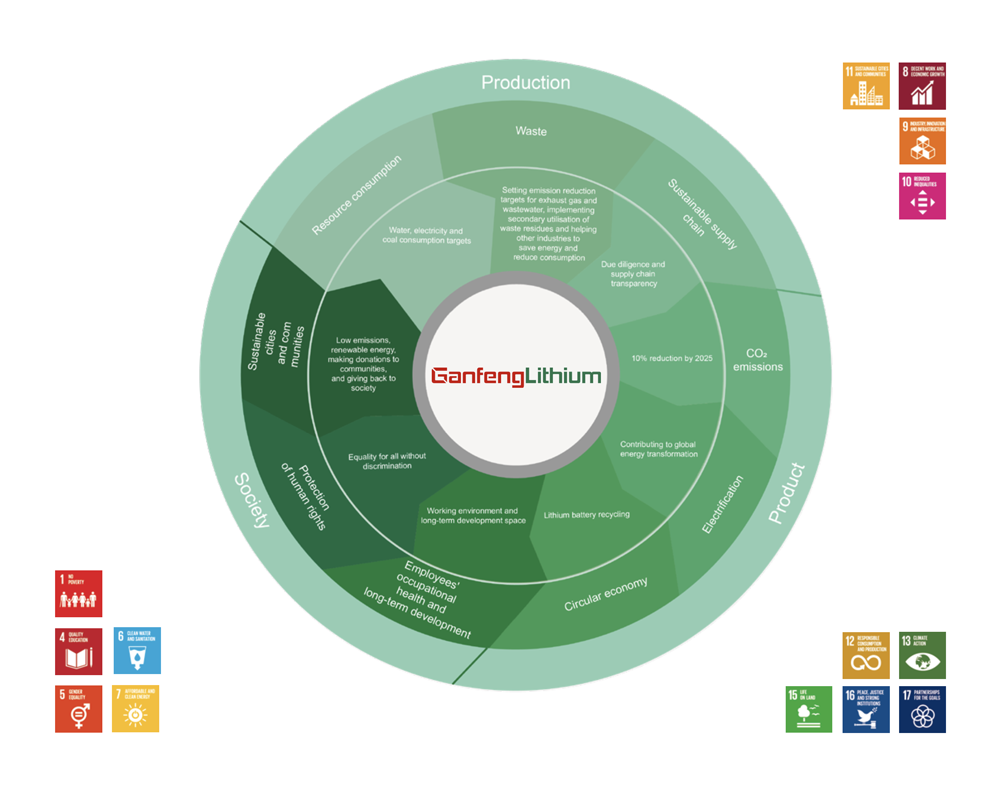 Ganfeng Lithium has been deeply involved in the new energy industry for more than 20 years and has always adhered to the path of sustainable development. It not only ensures that the production process is friendly to the environment and the human body, but also ensures that the products can cope with global climate change and help the global energy transition. The sustainable development portrait of Ganfeng elaborates Ganfeng’s responsibility for sustainable development from three perspectives: product, production, and society, and responds to the United Nations sustainable development goals one by one.